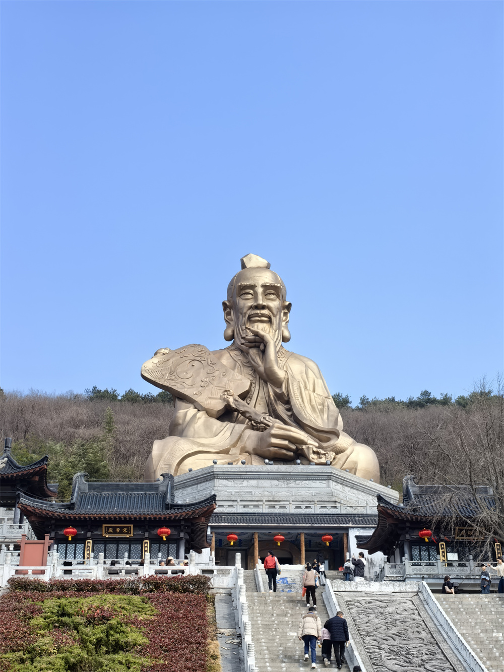随后,大家乘车下山,来到老子铜像景点。30多米高的老子铜像,庄严肃穆,威严而祥和。导游小姐的讲解,如同一把钥匙,打开了大家对老子智慧的探索之门。当得知老子铜像手心中数年来聚集了两米多长、一米多宽的蜂巢时,大家纷纷举起手机,调节放大倍数,拍摄这神奇的画面。蜂巢沉积的真实画面,让众人惊叹不已。这不仅是自然界生物的伟大,更是人类地理建筑的吉祥象征,寓意着人们蜂拥而至参拜老子,传承着古老智慧与文化。