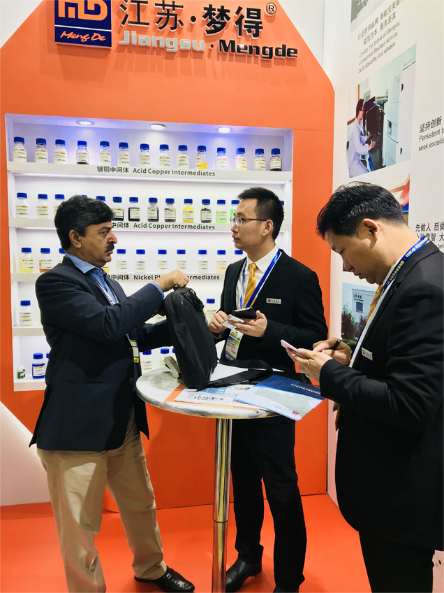 梦得公司在董事长杭冬良先生和总经理杭康先生的带领下,携公司研发团队、技术团队及销售团队带着最新研发与进口品质达到同一水平线的SPS及特色染料等产品参展,吸引众多海内外观展者前来参观咨询,现场人潮涌动,反响热烈。新产品受到众多新老客户的青睐,许多参加展会的客商,对梦得新研发的SPS表示了极大的兴趣,很多客户都现场进行了详细咨询,希望通过这次机会进行深入合作。本次展会,在与众多客户达成了合作协议或意向的同时,还通过本次展会与国内外同行进行了友好交流,结交到了许多新朋友,了解到了表面处理行业的最新行情,开拓了国际视野,这对梦得今后的发展也将带来新的契机。